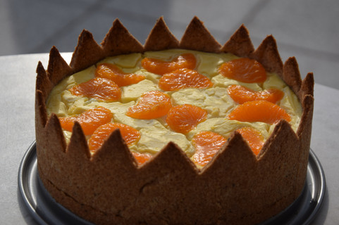 Für die Käsefüllung Pudding mit Milch und einer Prise Salz laut Anleitung kochen und auskühlen lassen. Den ausgekühlten Pudding glatt mixen und mit Topfen, Sauerrahm, Zucker und Zitronensaft vermischen. Den Mürbteig nun glatt ausrollen und eine 26-cm-Springform damit bis zum Rand hinauf auskleiden. Mit einem Messer nun Kronenzacken in den Teig schneiden. Der übrige Mürbteig kann auf den Boden angedrückt werden. Die Pudding–Topfen-Masse in die vorbereitete Form gießen. Die Mandarinen aus der Dose nehmen, abtropfen lassen und je zwei Spalten davon in Schmetterlingsform auf dem Kuchen verteilen.